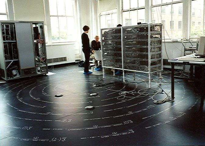 楚德诺夫斯基兄弟在纽约大学理工学院的数学和先进计算研究所的实验室地板上是一圈超几何级数,其中大多数都是他们发现的,包括他们用来计算派的楚德诺夫斯基算法。
