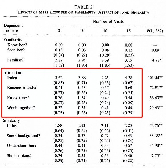 学期末,实验者让所有学生给这 4 名女生打分,结果是:出现次数越多的女生,吸引力越高。