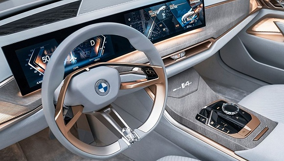 在于今年发布的BMW i4纯电动概念车上,宝马对内饰,特别是屏幕部分进行了颠覆性创新,将一块一体式曲面无边框触控显示屏塞入方向盘后。该曲面显示屏采用无反射玻璃制成,让整个座舱变得简洁而整齐。这块屏幕负责集成车内绝大部分控制功能和信息显示,通过触屏可以完成大部分车内操作,该变化将触控件的数量减到了最少。