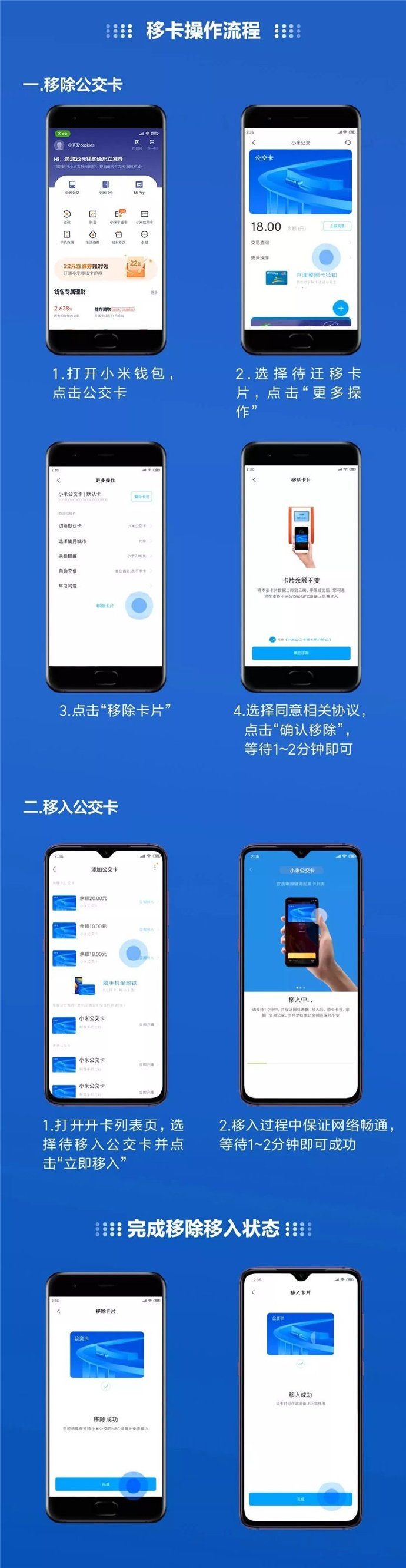 1.全程在小米钱包内操作;2.卡片移出、移入时使用的小米ID需和开通该卡时的小米ID一致;3.深圳通一个自然年内仅支持迁移一次,移出后不支持移回本机,且不支持迁移卡号、余额和交易记录等信息,移入的新卡需重新充值使用,原卡内余额将于30天内退还;4.上海公共交通卡移卡前后卡号、余额保持一致,交易记录、当月累计消费金额不予保留,建议月初月末进行操作;5.移入机型仅限支持开通该卡片的机型,如机型暂未适配对应卡片或由于卡片已下线不支持新机型则无法移入;6.深圳通系统升级,移卡服务暂时暂停,待深圳通系统升级完毕后恢复移卡服务。