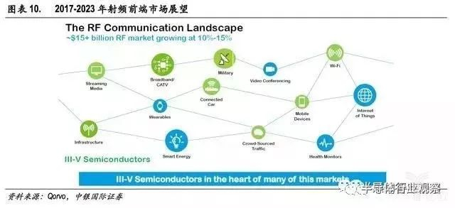 射频前端除了用在各类型便携设备中,还应用在WiFi设施、IoT、智能电网、可穿戴设备等,而其中三五族化合物半导体会占据RF市场的核心。