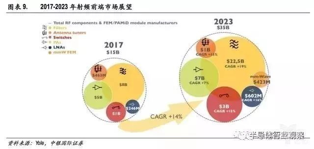 根据Yole的预测,全球滤波器市场将会从2017年的150亿美元增长到2023年的225亿美元,年复合增长率达到19%。