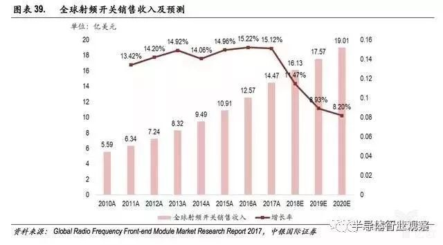 射频开关在5G要求下既要满足高功率高频率要求,也要配合更加复杂的射频信号路径进行结构性提升。射频开关可能会采用化合物半导体工艺如GaN、GaAs工艺等,或继续沿用RFSOI工艺。根据QYRElectronicsResearchCenter预计,到2020年射频开关市场会达到19.01亿美元。
