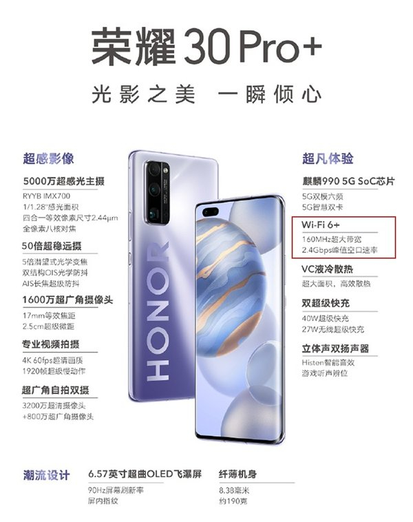 Wi-Fi 6就像是高速道路,它拓宽了道路,并开放了速度上限9.6Gbps,这是这项技术的进阶优势。不过,这并不意味在这条高速道路奔跑的个体,都能达到9.6Gbps。比如小米10 Pro和荣耀30 Pro+在宣传时,都宣称支持Wi-Fi 6技术(荣耀30 Pro+支持Wi-Fi 6+)。但区别的是小米官方将9.6Gbps理论最高值当做小米10 Pro的吞吐量,而荣耀30 Pro+的宣传页写的是160MHz超大带宽,2.4Gbps峰值空口速度。那么它们之间会否有差别呢?