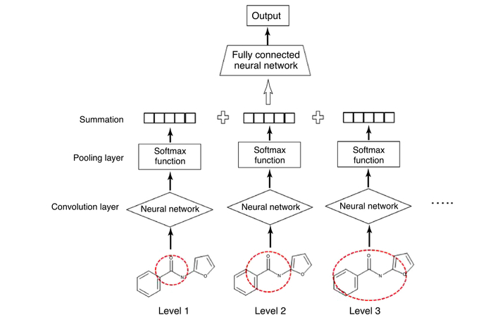 另一类用于化合物活性预测的方法是图卷积模型(graph convolution models),其基本思想是利用神经网络 NNs 自动生成一个分子描述向量,通过训练 NN 来学习向量值。受 Morgan 的圆形指纹方法(circular fingerprint method)启发 [31],Duvenaud 等人提出了神经指纹方法(neural fingerprint method),通过引入图卷积模型将神经指纹作为分子描述向量,该方法的工作流程如图 1 所示 [3]。首先,读取 2D 分子结构以形成状态矩阵,其中包含每个原子的原子和键信息(基于与原子相连的键)。然后,状态矩阵通过单层神经网络进行卷积运算,生成固定长度的矢量作为分子表示。通过考虑相邻原子的贡献,卷积运算可以在不同的层级上进行,这相当于在不同的相邻层级上的圆形指纹。由不同卷积运算产生的向量首先经过一个 softmax 变换,然后求和形成化合物的最终载体,它是编码分子水平信息的神经指纹。神经指纹通过另一个全连接的神经网络层来产生最终的输出。神经指纹中的比特值是通过训练学习的,并且是可微的。