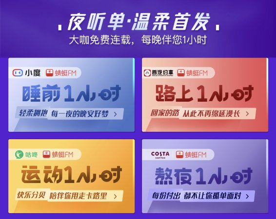 除了打造夜听IP内容之外,蜻蜓FM也对夜听场景进行了更细分的运营,结合用户的具体使用场景,针对“睡前一小时”、“路上一小时”、“运动一小时”和“熬夜一小时”四个场景,平台与百度小度、首汽约车、咕咚运动和Costa咖啡合作首发夜听单产品,为不同场景下的用户定制个性化的音频内容,这也是蜻蜓FM从内容的收听平台,转向综合性内容服务平台的重要标志。