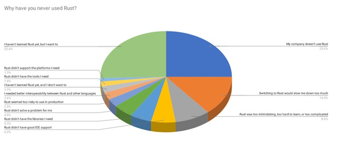 受访者指出,如果公司愿意采用,且 Rust 有更多的库和更好的 IDE 支持的话,他们愿意更多地使用 Rust。