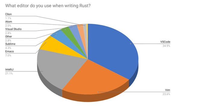 使用 Rust 时,Vim 和 VSCode 是最受欢迎的编辑器,其次是 Intellij。
