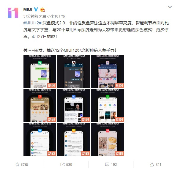 今天下午,MIUI官方揭晓,MIUI12 深色模式2.0,非线性反色算法适应不同屏幕亮度,智能调节界面对比度与文字字重,与20个常用App深度定制为大家带来更舒适的深色模式!更多惊喜,4月27日揭晓!