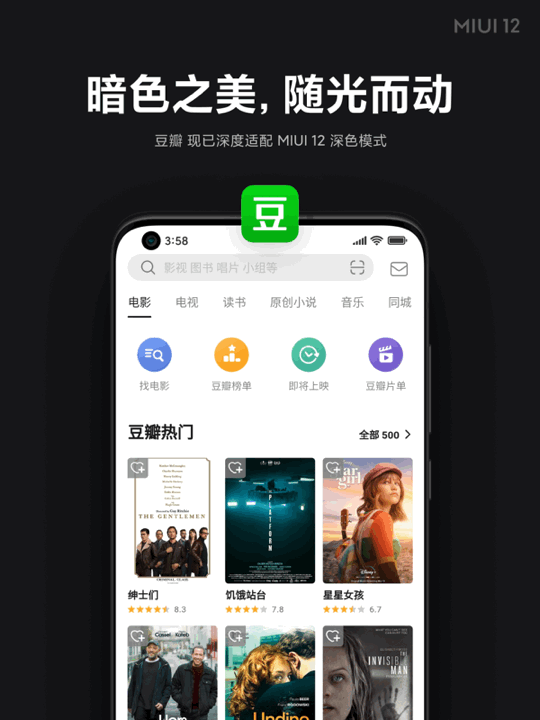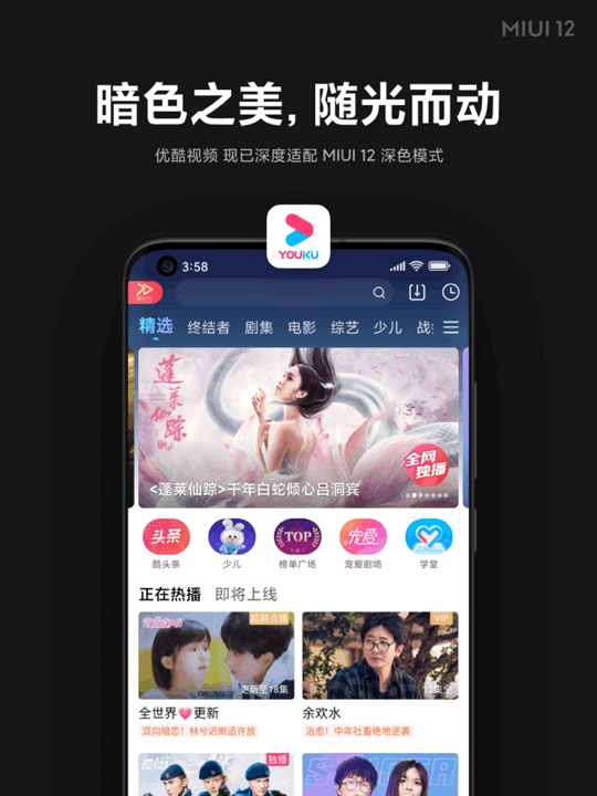 在介绍中,包括微信、QQ、优酷视频、喜马拉雅、豆瓣、钉钉、QQ邮箱、WPS等已适配MIUI 12深色模式2.0。