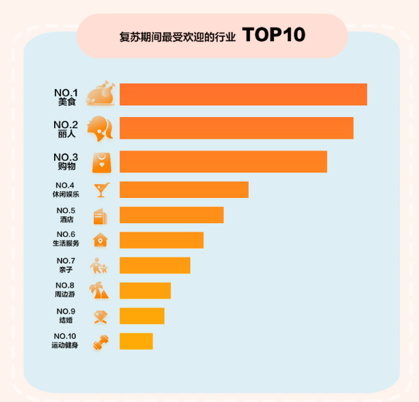 民以食为天,生活复苏期间,美食当之无愧成为最受欢迎的行业。被压抑许久的美容、美发需求也得到释放,丽人行业因此排在第二位。购物、休闲娱乐、酒店和生活服务紧随其后。