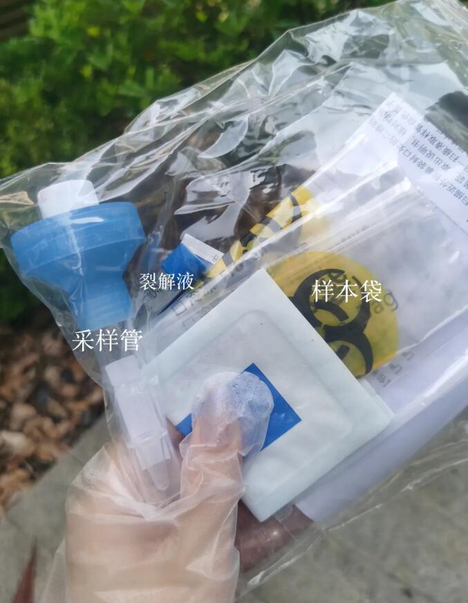 等待十几分钟后,工作人员领着记者来到位于检验中心后门旁边的采样区。负责样品保存的工作人员递给记者一包东西,里面包含了2片酒精棉片、1支采样管、1支裂解液、1个保存袋、1张说明书。工作人员介绍道,先拧开采样管的白色盖子,将痰液吐进采样管中后,待痰液流入采样管底部,再去除采样管的蓝色部分,倒入裂解液,拧上白色盖子,将采样管置于样本袋中后,再交还给工作人员。