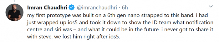 据Chaudhri透露,他在打造初代Apple Watch前期原型则是将第6代iPod Nano绑在一条Apple Watch表带上,与此同时在上面展示作为Apple Watch核心功能的Siri和Notification Center(通知中心)。