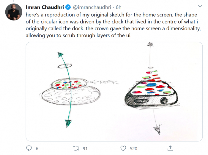 Chaudri分享了其为Apple Watch Home界面做的设计初稿草图复制品以及受时钟启发的圆形图标形状--一开始被叫做dock。在发布之前,Digital Touch功能则被叫做Electronic Touch。表盘上的ink灵感则来自Chaudhri的涂鸦生涯。