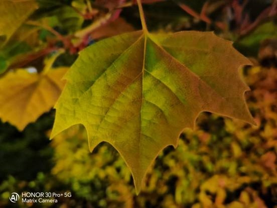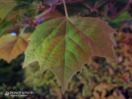 荣耀30Pro +也有少许偏黄,不过依然保留了绿色基础,而且叶脉纹理的边缘明显比iPhone 11清晰。