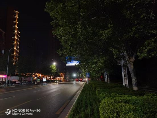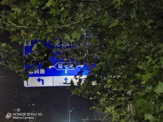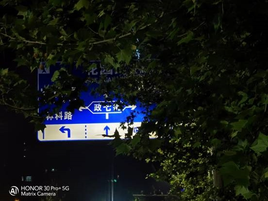 与此同时,荣耀30 Pro+亮度也有了明显提升,而画面以及没有过曝,路牌清晰的几乎与白天无异,称之为“长焦夜视仪”也不为过。