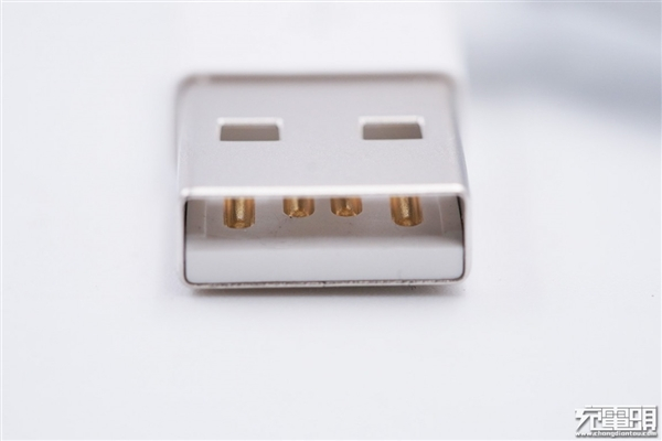 微距看一下USB-A接头的内部,共有四颗触点,较长的触点位于两侧,中间是两个短触点。