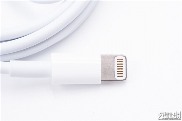 线材的Lightning插头特写,八个金色的触点整齐的排列在一起。