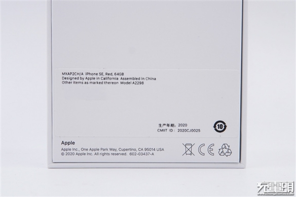 盒子背面的底部,带有iPhone的信息,MXAP2CH/A,代表这是一部国行的iPhone SE,红色,机身存储为64GB。Designed by Apple in California Assembled in China,由位于加利福尼亚州的Apple设计,在中国组装完成。