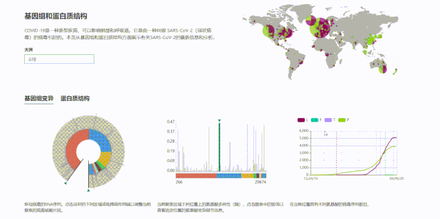 相比上述板块,「基因组和蛋白质结构」板块则显得比较抽象了,该板块展示了 SARS-CoV-2(新型冠状病毒)的病毒学分析结果,主要将目光放在 SARS-CoV-2 病毒本身,主要包括以下两个功能: