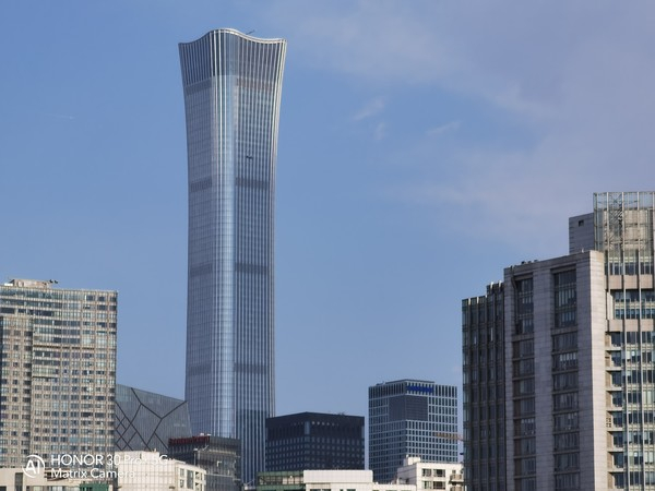 在这组5倍变焦样张中,荣耀的优势较为明显,当然这也与其本身的功能有关。由于荣耀30 Pro+支持5倍光学变焦,因此画面有着非常高的清晰度和精细度,比如建筑物上的“朝外SOHO”字样和楼体细节,同时颜色还原也最为准确。值得注意的是,这款手机压光效果明显,楼宇上的玻璃幕墙没有出现明显的过曝。