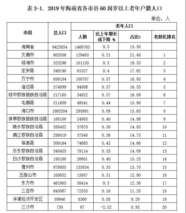 全省老年人口占比前三:文昌琼海定安