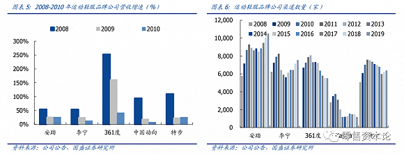 在门店数量上,国盛证券分析师估算当时门店数量超过3000家的品牌超过15 个,其中安踏/李宁/361 度/特步品牌门店数量在2011 年均超过了8000个。