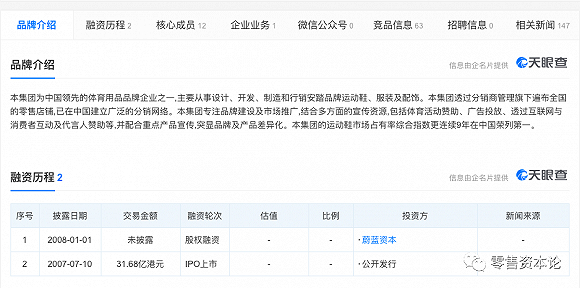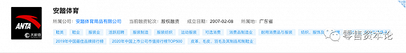 天眼查数据显示,安踏体育所属公司:安踏体育用品有限公司,成立于2007年2月8日,当前有2次融资历程。