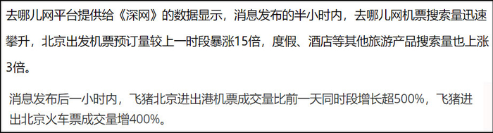 4月29日下午消息,北京市宣布公共卫生应急响应级别调至二级后。多家OAT网站数据显示:消息发布的60分钟内,北京出发的机票预订量较上一时段暴涨15倍,北京进出港机票成交量比前一天同时段增长超500%,北京至成都、昆明、重庆、上海、杭州、长沙等航线价格快速上涨,度假、酒店等其他旅游产品搜索量也上涨数倍。