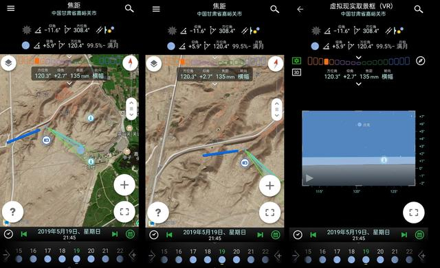 这需要做很多的工作:首先要查询月亮升起的方位角度。比如对于这张嘉峪关的照片而言,因为提前了解到当天月亮在21点15分从东偏南25度的位置升起,所以就要在嘉峪关的反方向,即西偏北25度的方向上寻找合适的机位。距离越远,使用长焦镜头拍摄,月亮相对前景看起来就更大,反之月亮看起来就小。这时我们可以使用APP摄影助手Planit,制定拍摄计划。