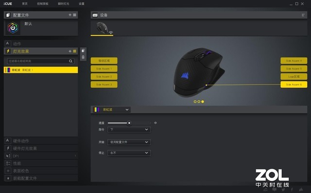 使用海盗船的产品就不得不提到海盗船iCUE官方驱动。iCUE驱动是各大外设厂商驱动中集成性、功能性以及稳定性都很出色一款。在驱动设置界面,我们可以看到,DARK CORE RGB PRO SE鼠标拥有共8个可以分别调节的灯光区域。这种随意调节鼠标外观的自由度是我前所未见的。