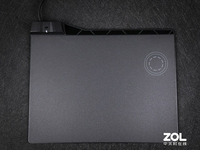 海盗船MM1000无线充电鼠标垫是一张树脂硬垫。具体尺寸为260mm×350mm,属于中等大小,可以满足FPS游戏的拉墙操作,也不会占据过大空间。除了左上角的充电指示灯外,垫上没有其他灯光位置,整体外观较为低调。
