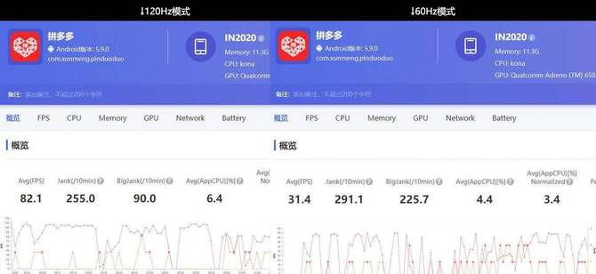 此外,我们也进行了日常APP的帧数监测,可以发现在打开120Hz模式后,一加8 Pro在拼多多这类日常APP的帧数也直接提升到120帧,与屏幕刷新率相匹配。这也说明一加已经与软件商做好了适配,让120Hz屏幕的实力得到充分发挥。