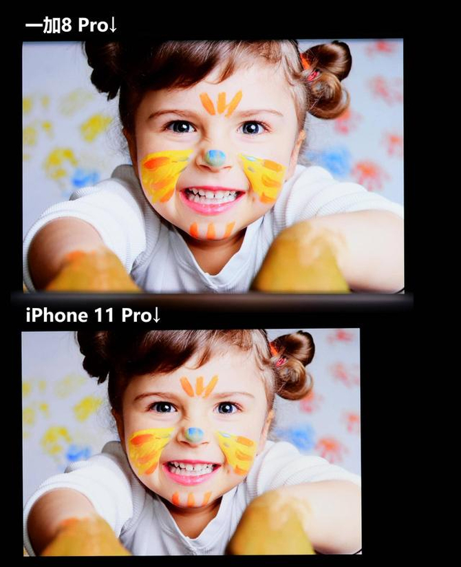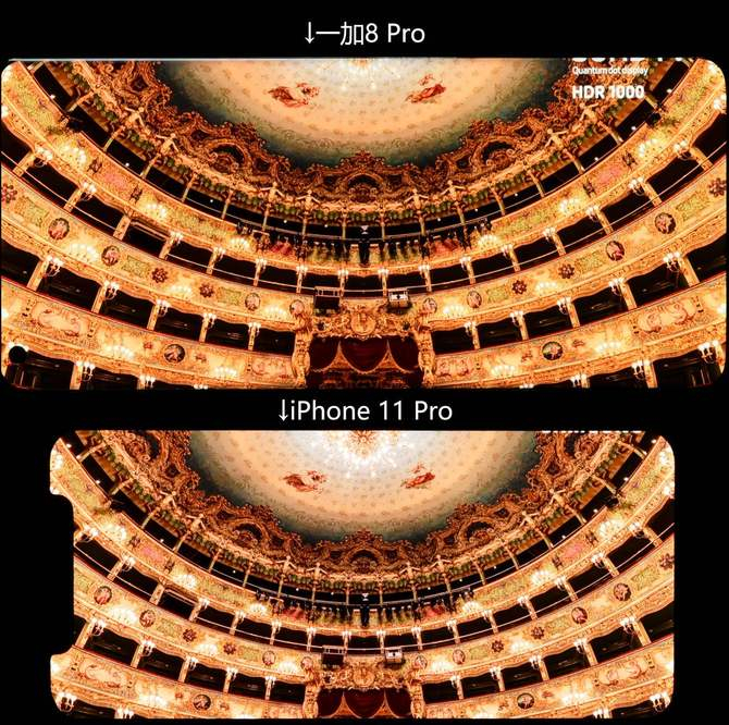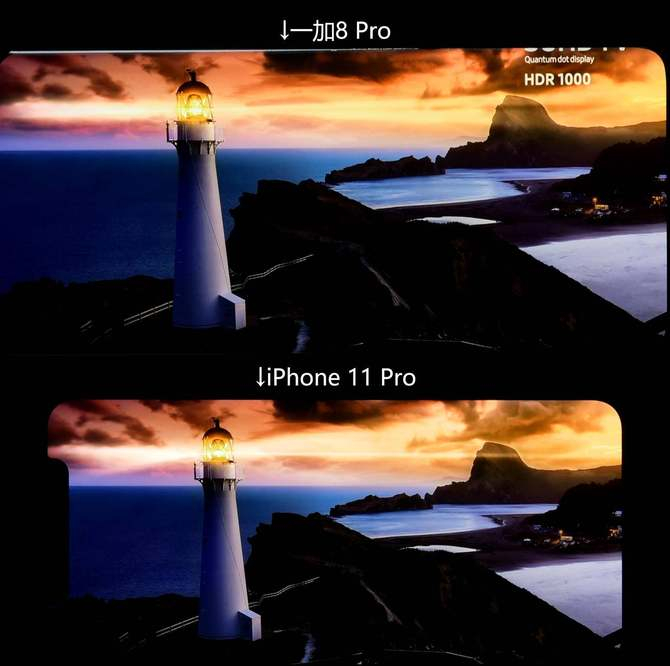 一加8 Pro的屏幕参数让人兴奋,那么在实际中的体验又是如何呢?作为参考,这里拿出屏幕显示效果优秀的iPhone 11 Pro作为对比,我们在相同的设定下进行了屏幕翻拍(100%亮度)。
