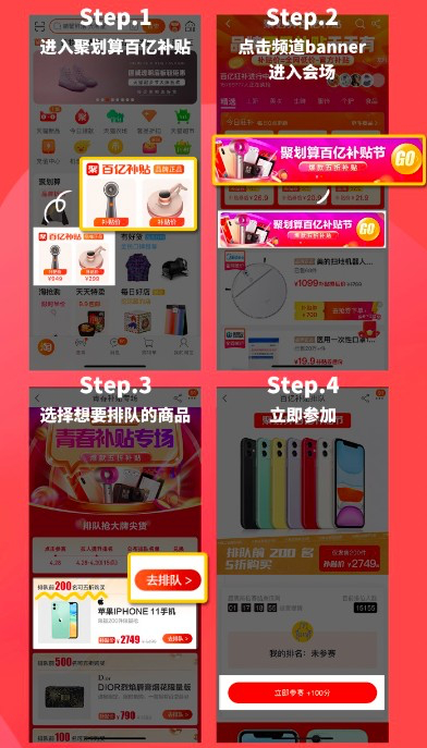还不知道怎么参加聚划算百亿补贴节“五折排队”的小伙伴可要仔细看好下面的玩法介绍了,毕竟只要买到就是赚到,这么好的薅羊毛机会千万不要错过!