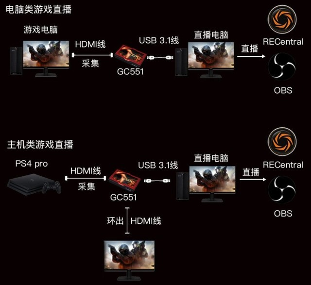 例如,直播需要OBS引流,所以就需要把直播电脑的画面引到OBS中,在通过OBS推流来实现画面的同步,如果玩游戏的设备与OBS是一台主机,那就会对电脑的素质造成很大的负担,所以尽可能的使用两台电脑,然后通过采集卡实现游戏主机的画面采集,采集到直播的电脑,然后在通过OBS完成画面的传输。