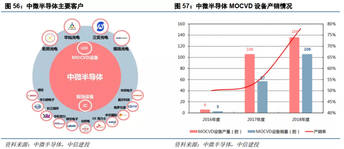 整体来看,国内刻蚀机国产化率达到18%,中微公司和北方华创贡献较多。根据中芯国际、长江存储和合肥睿力的招标情况看,从中微采购的刻蚀机台数占整体刻蚀机台采购比例约15-20%,逼近东京电子和应用材料,进步明显。按材料分,国内介质刻蚀设备市场中,中微占有25%份额,国产化率在各类半导体设备中属于较高水平;而在硅刻蚀设备市场中,北方华创占有15%市场份额。