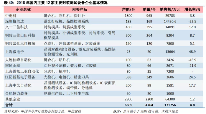 先进封装设备国产化率正逐步提高,传统封装设备国产化率较低。根据中国电子专用设备工业协会统计,目前12英寸晶圆先进封装、测试生产线设备中,已有17种实现高度国产化,国产化率可达70%。封装用光刻机,倒装、刻蚀、PVD、清洗、显影、匀胶等设备均已满足国内先进封装需求,部分实现批量销售。先进封装用前道设备国产率较高,光刻机、刻蚀机、植球机等超过50%,但传统封装设备国产化率整体不超过10%,主要设备如划片机和键合机等仍然严重依赖进口,传统封装设备是被忽视环节,亟需支持。