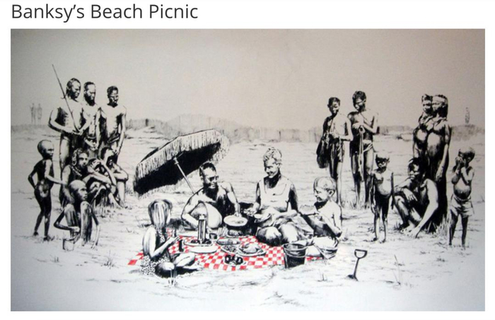街头艺术家Banksy的作品,在红白野餐布内外,白人中产家庭和非洲土著之间似乎有不可逾越的鸿沟。