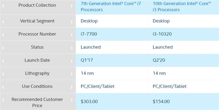 首先,i7-7700与2017年Q1发布,i3-10320则是在今年的Q2发布,发布时间相隔三年。两款产品都是14nm工艺,价格相差一倍。