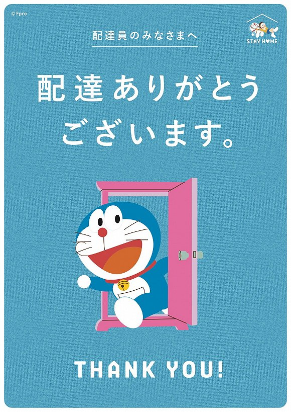 在这个名为“STAY HOME(留在家中)”的公益计划中,他们同时也将“戴口罩的哆啦A梦”制成了不同尺寸的壁纸供人们下载使用;并专门为餐饮店制作了免版权费的图片——如今日本餐饮店外卖订单增多,不少外卖员仍然在外奔波,因此他们制作了一张哆啦A梦用任意门穿梭的图片,上面写着“给配送员:谢谢你们”,餐饮店可以免费下载或直接在便利店打印出来,贴在餐品包装上。