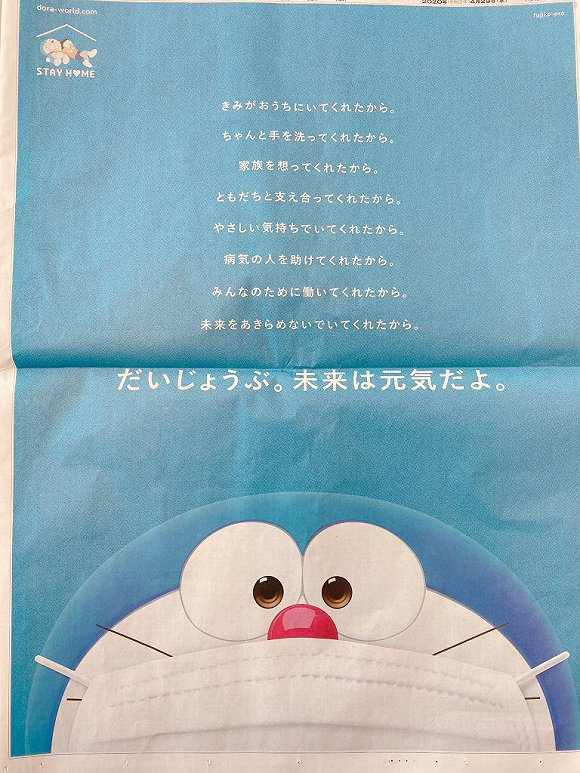 在这个坏消息不断的时期,4月29日,《朝日新闻》刊登了一封由哆啦A梦写的公开信。在这封信中,哆啦A梦也戴上了口罩,并且鼓励人们“因为你乖乖待在家,因为你认真洗手,因为你为家人着想、和朋友相互扶持,因为你有一颗温柔的心,因为你帮助了那些生病的人,因为你为了大家还在工作……别担心,未来会是光明的”。这段文字还被译成英文、中文、韩文等7种语言,在哆啦A梦的官方账号中发布。
