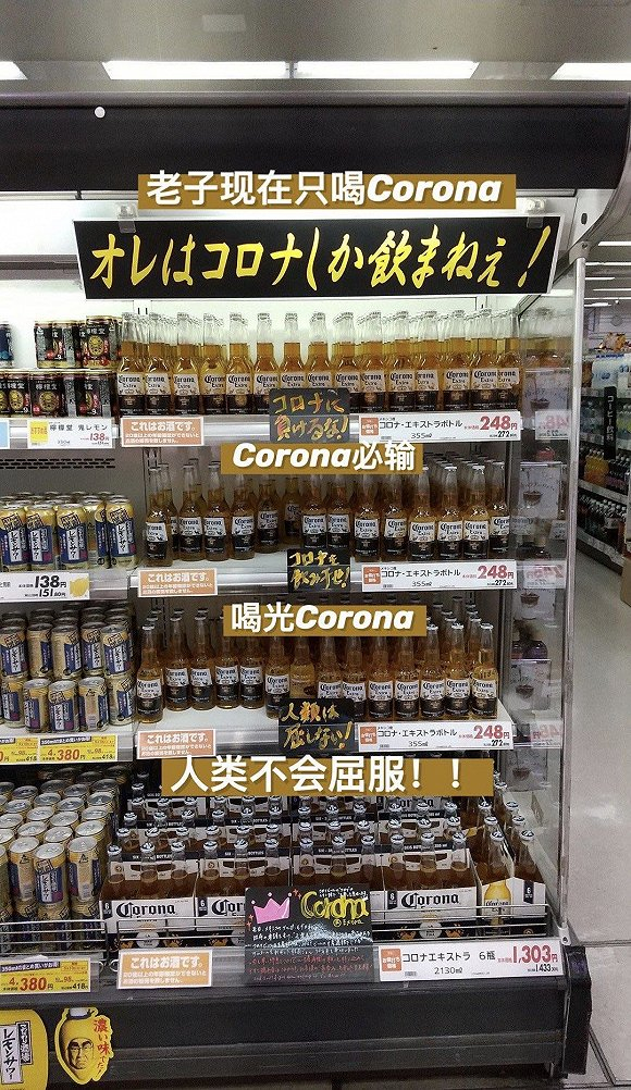 不过在日本超市,为了卖出滞销的科罗娜,超市的宣传卖货却相当热血:在科罗娜的啤酒货架上,贴上了“本大爷只喝科罗娜”、“别输给科罗娜啊!”“人类是不会屈服的”等标语,鼓励消费者购买科罗娜啤酒,也是鼓励人们抗击新冠肺炎疫情的双关。