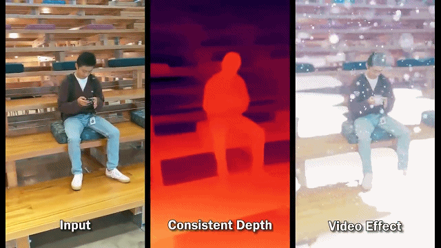 该研究提出的方法可以从手机摄像头随意拍摄的视频中生成具备几何一致性且没有颤动的深度估计结果。