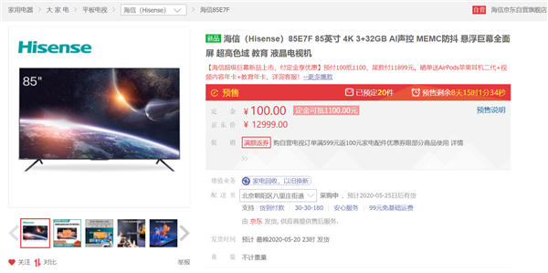 5月4日,海信85寸液晶电视85E7F在京东上架,预售价格12999元,缴纳100元定金可抵1100元,实际成交价格为11999元,是上市以来历史最低价位。另外晒单还赠送AirPods2无线蓝牙耳机以及视频内容年卡。