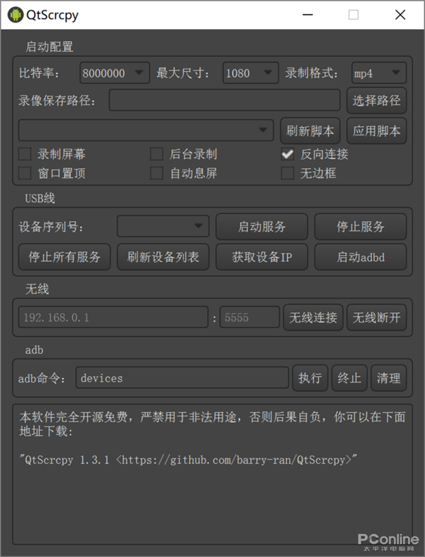 直接运行“QtScrcpy.exe”,就可以开始配置了。QtScrcpy支持无线连接,但首次配置需要用USB连线进行。将手机和电脑接入同一个Wifi网络后,让手机通过USB插入PC,即可按照下面步骤进行配置。