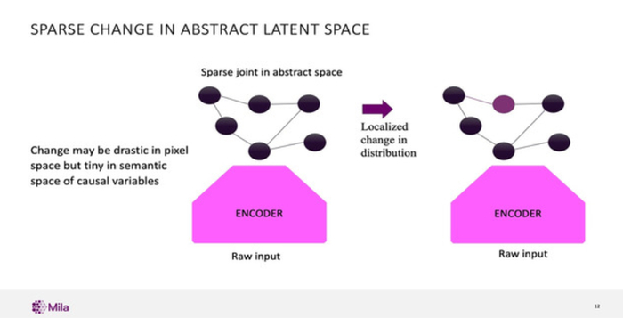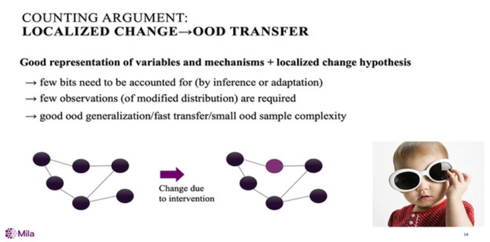 其实,在抽象空间中,更改是局部化的,可能只需要修改一个变量、一个条件或一个因素。因此,学习如何适应修改后的分布变得容易得多,如果以正确的方式表示信息,就可以快速传输。
