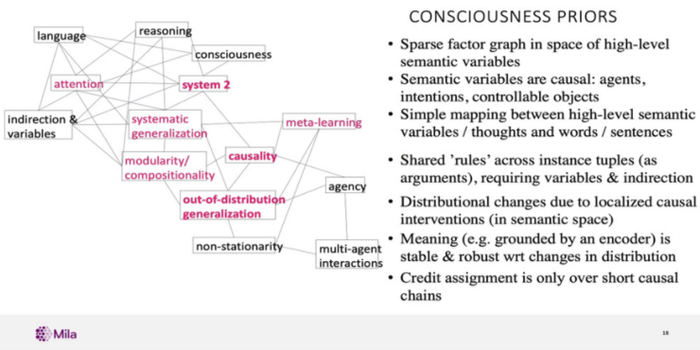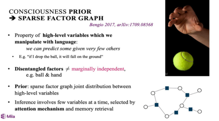 将意识加工到深度学习需要先验知识。那么什么样的先验知识能够帮助扩展深度学习,并使其融入高级概念和「系统2」任务存在的那种结构?第一个前提是有些高级别之间的联合分布的结构,也称为语义变量。联合分布可以用图形模型来描述,特别是因子图,因为它是稀疏的,每个知识涉及的很少。此外,这些变量往往与因果关系有关。