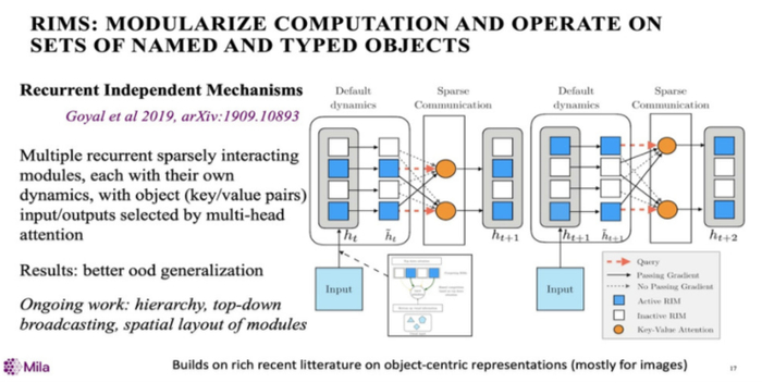 最后,提一下我想提的工作,一篇叫做《Recurrent Independent Mechanisms》的论文里面重新定义了一个新的recurrent neural net架构,在这个架构中,把recurrent net 分解成更小的模块,在每个模块里面,它是完全连接在一起的,并不是一个同质的网络。模块之间,有一个注意力机制,当然,你也可以认为这是意识的集中地。