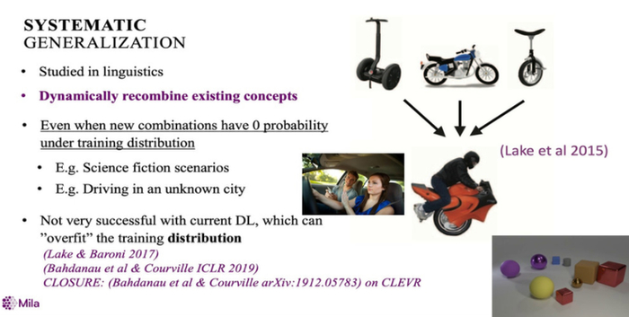 然后看一下「系统 2 」的任务涉及的有趣性质,也就是所谓的系统概括能力,专业的语言学已经对此做了非常多的研究,这些研究发现人类可以动态的重新组合现有的概念来形成一个新的概念。这些概念可以是口头的,也可以是视觉的,如上图所示,不同类型的车辆组合在一起形成了一个新的概念,这种概念的重组能够解释我们从未见到过的观测结果,即使是在训练分布概率为零的条件下也可以。